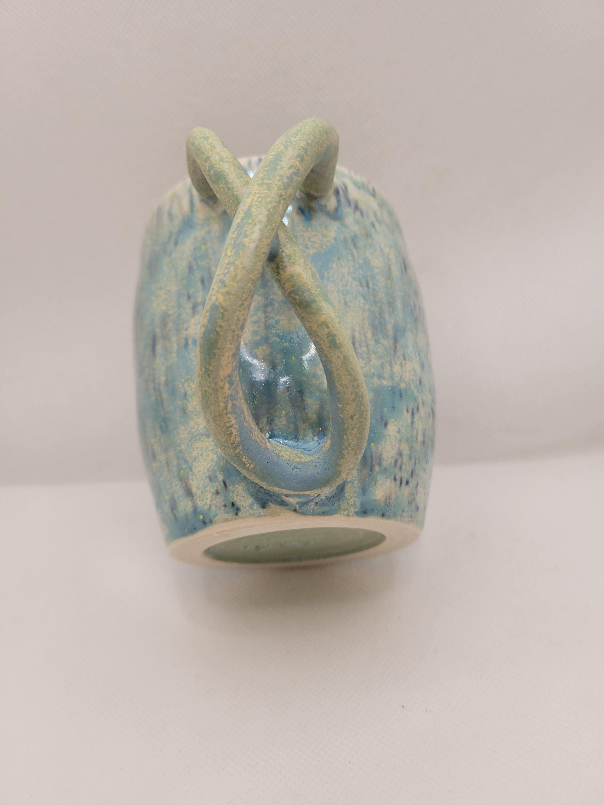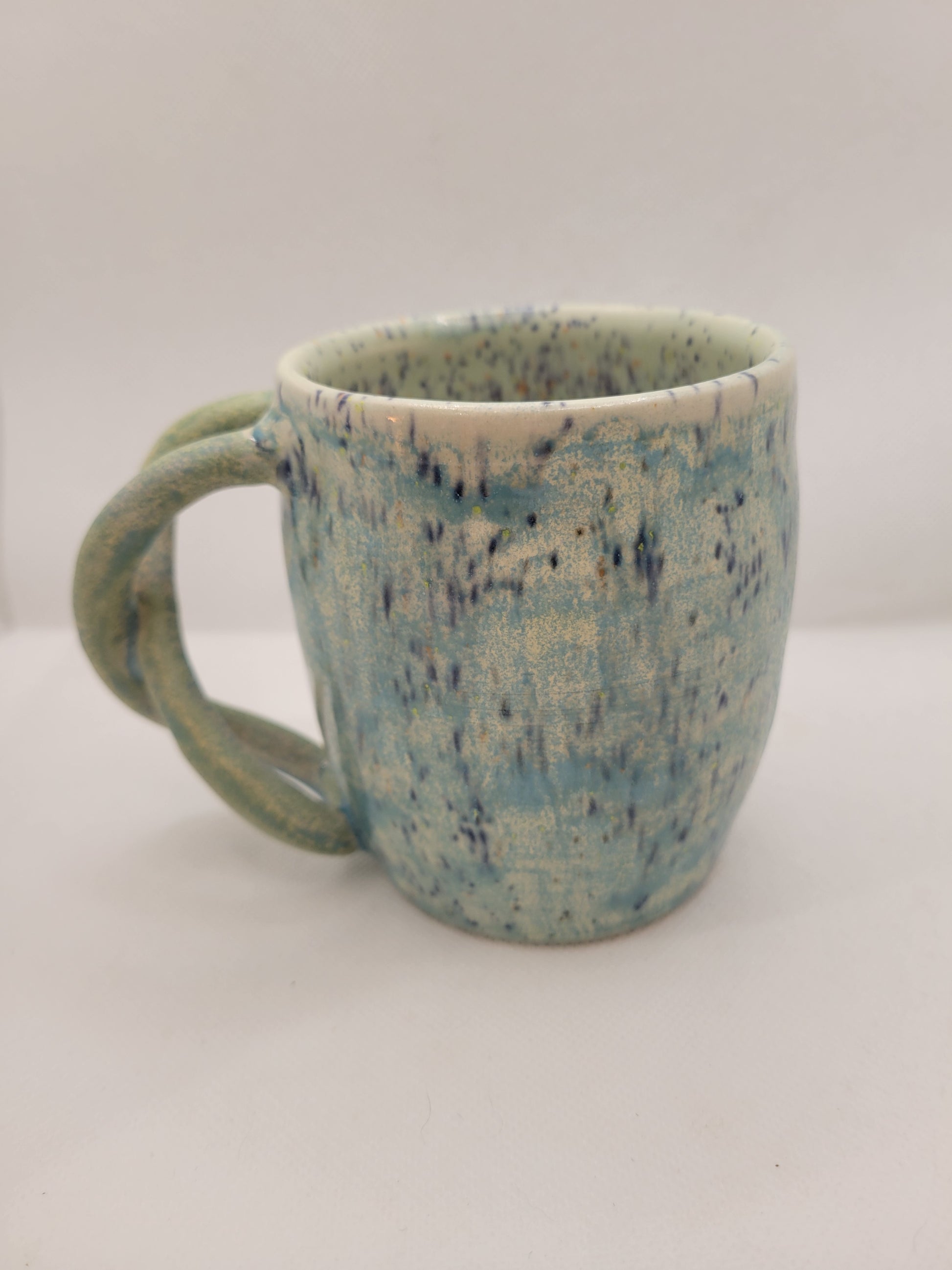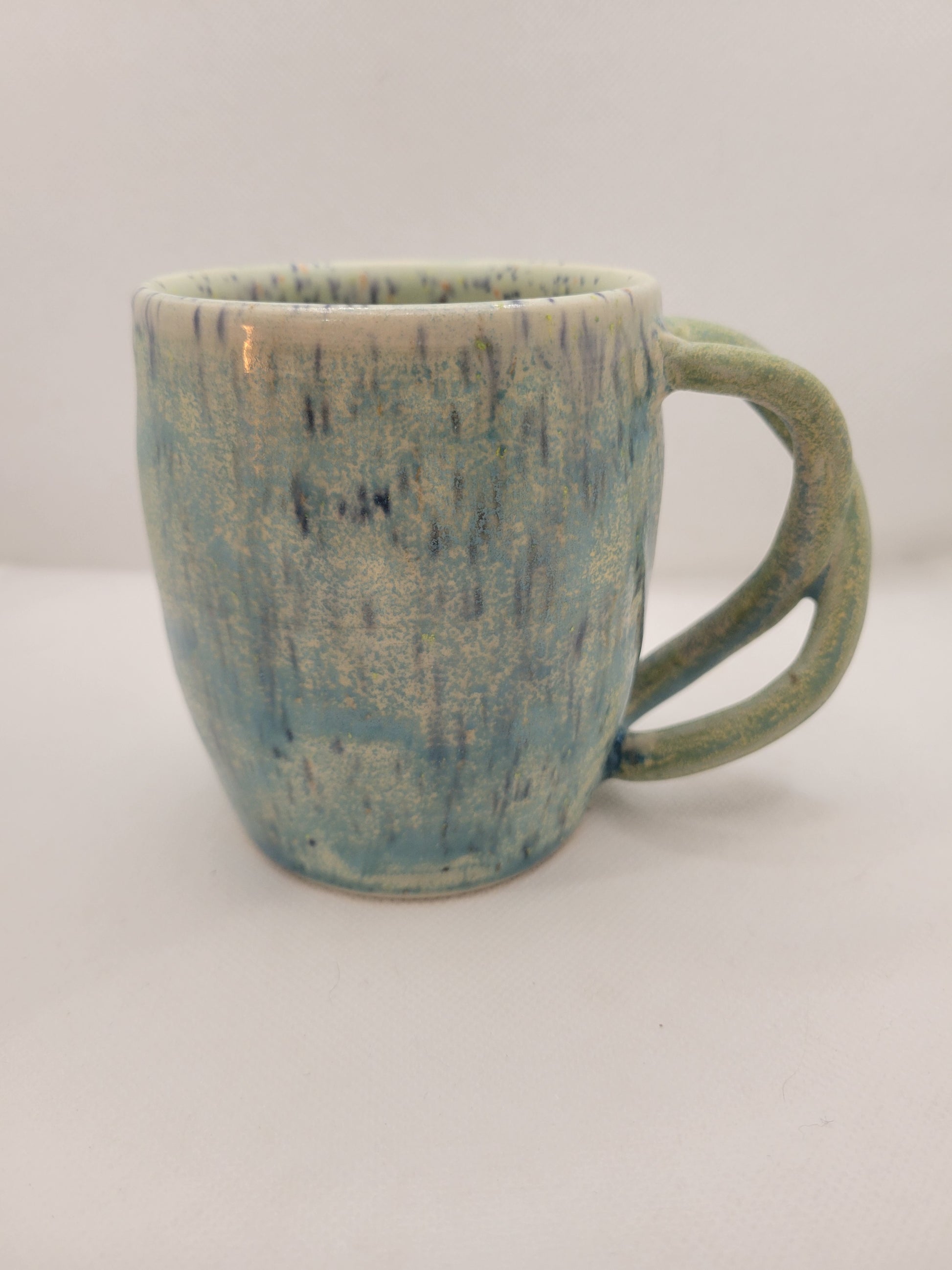 Dare to be as unique as this mug! That handle says so much for being a one of a kind hand made item. Adding this mug to your daily life will certainly be a bold statement of the social norms that will not restrain your favorite beverage. Made from stoneware pottery, this mug is not only stunning, but conveniently dishwasher and microwave safe and can hold 13 onces of what ever you wish to drink. Add this amazing piece to your collection before it is to late!