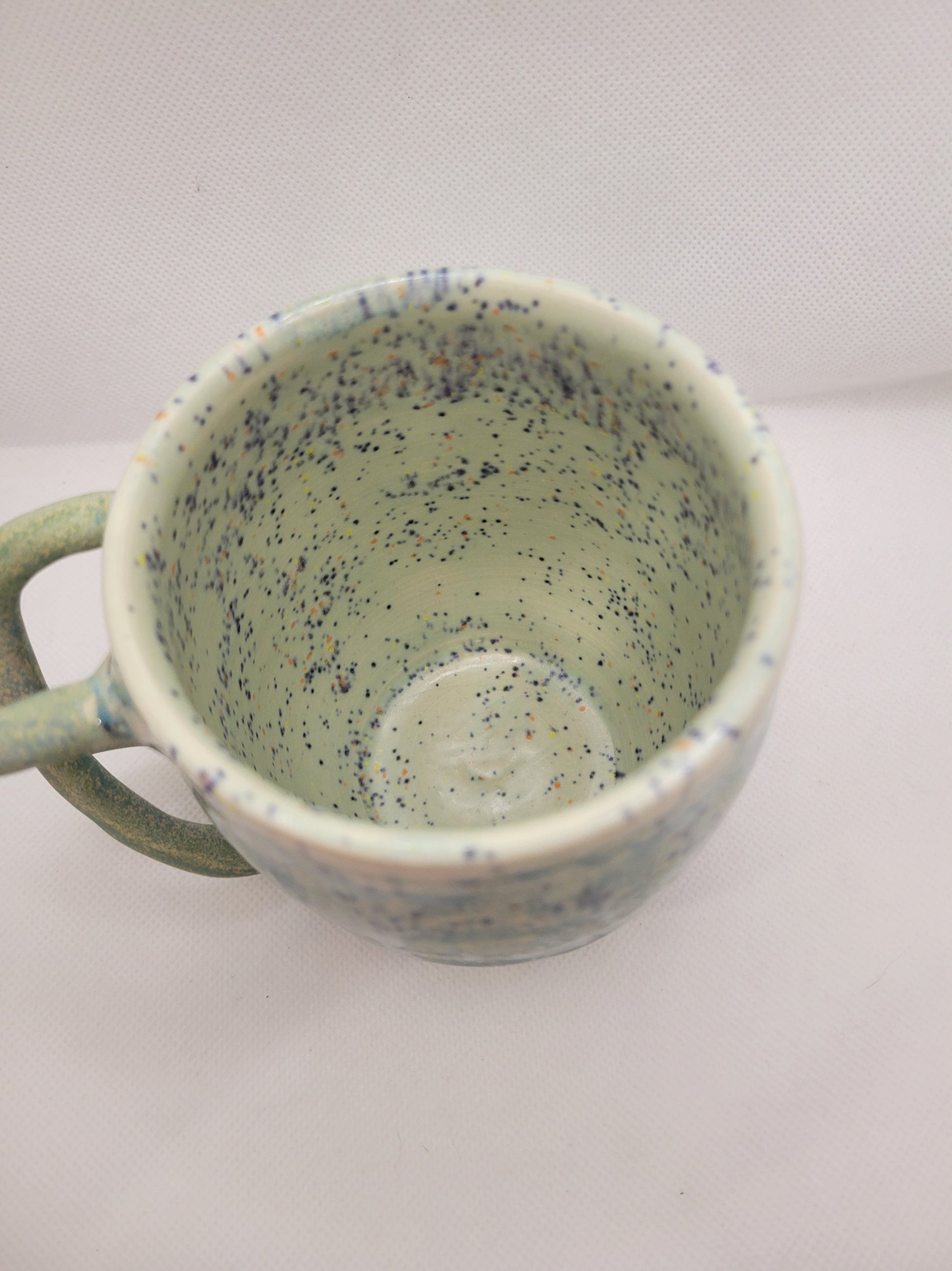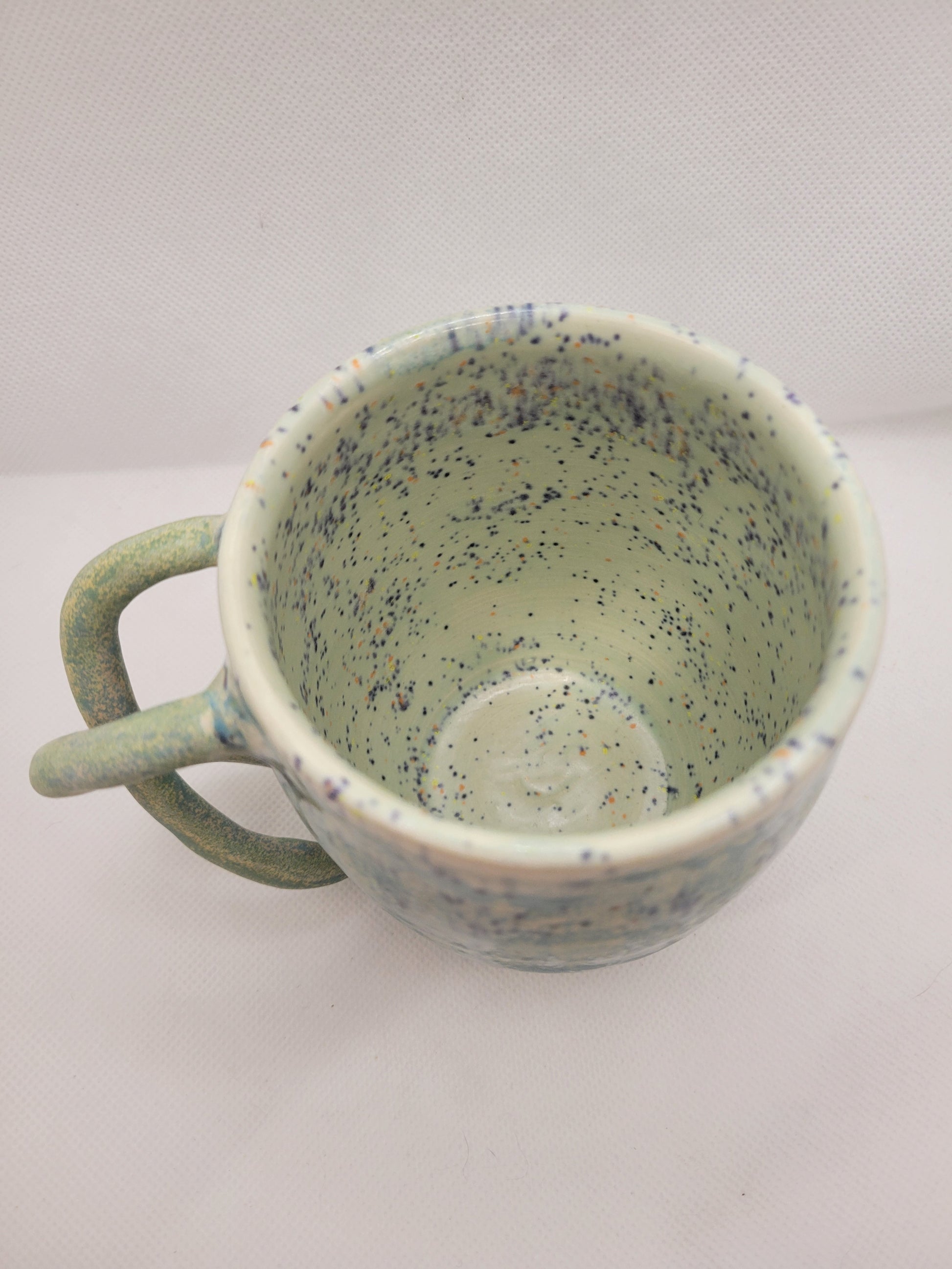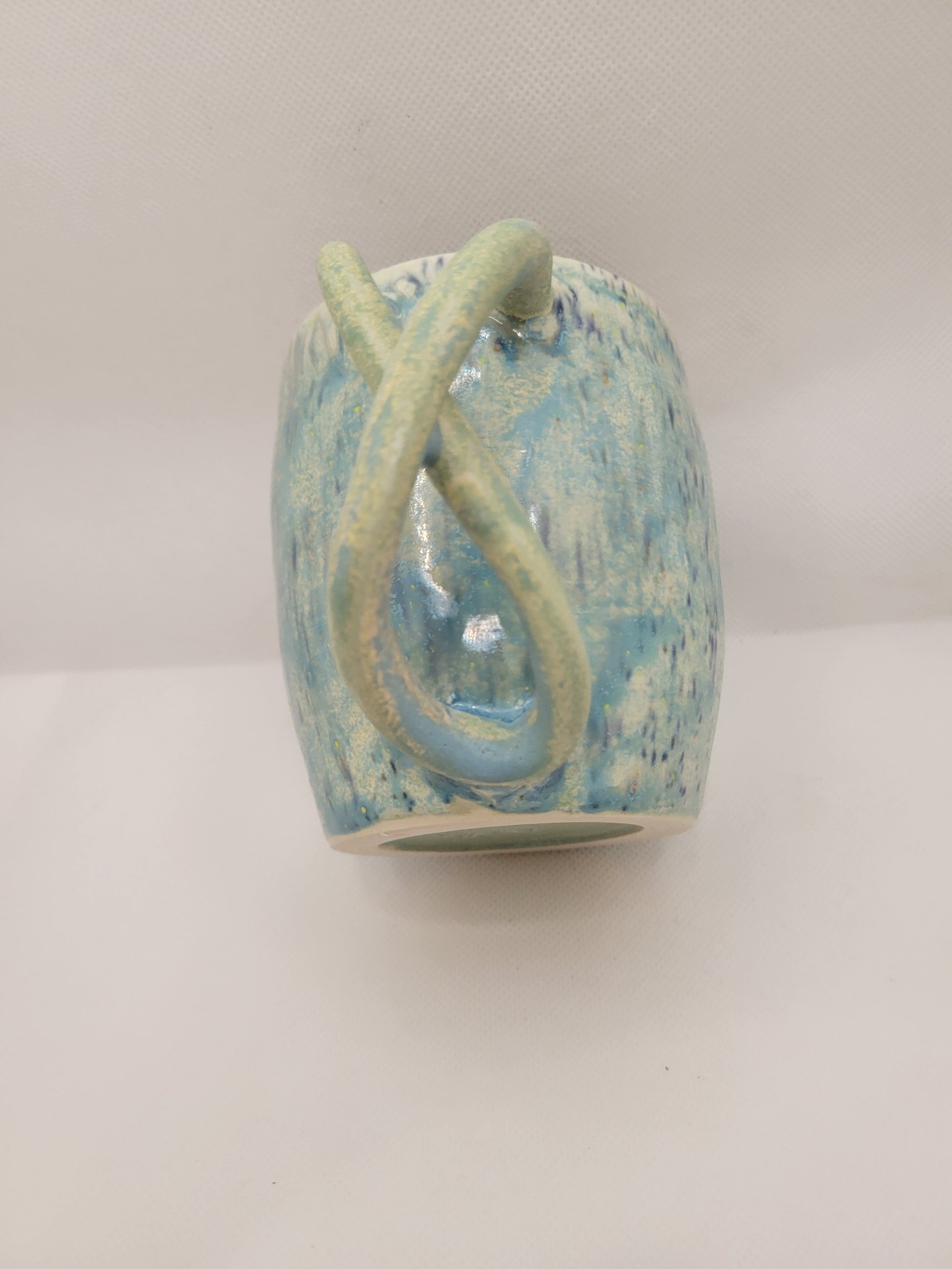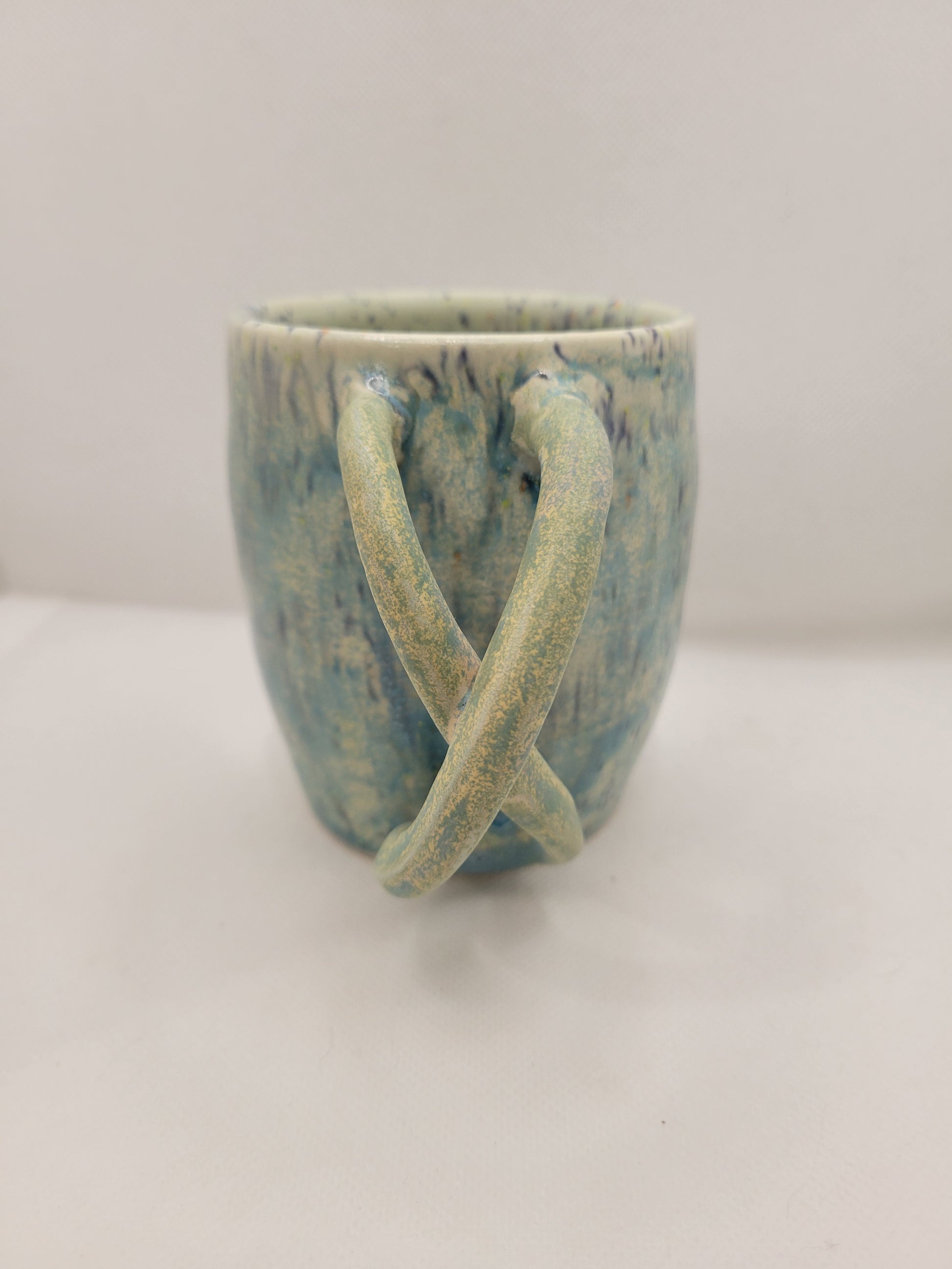 Dare to be as unique as this mug! That handle says so much for being a one of a kind hand made item. Adding this mug to your daily life will certainly be a bold statement of the social norms that will not restrain your favorite beverage. Made from stoneware pottery, this mug is not only stunning, but conveniently dishwasher and microwave safe and can hold 13 onces of what ever you wish to drink. Add this amazing piece to your collection before it is to late!