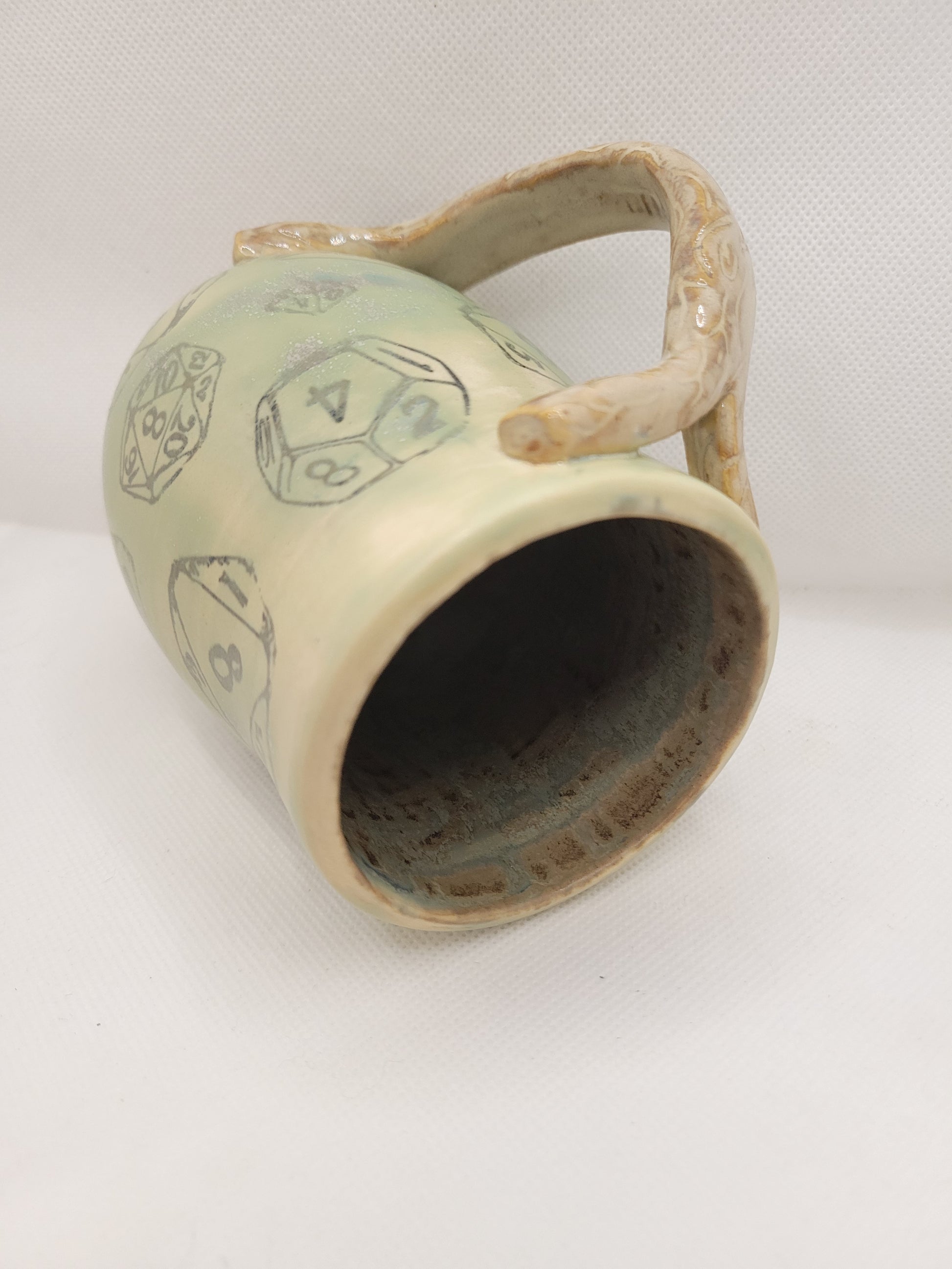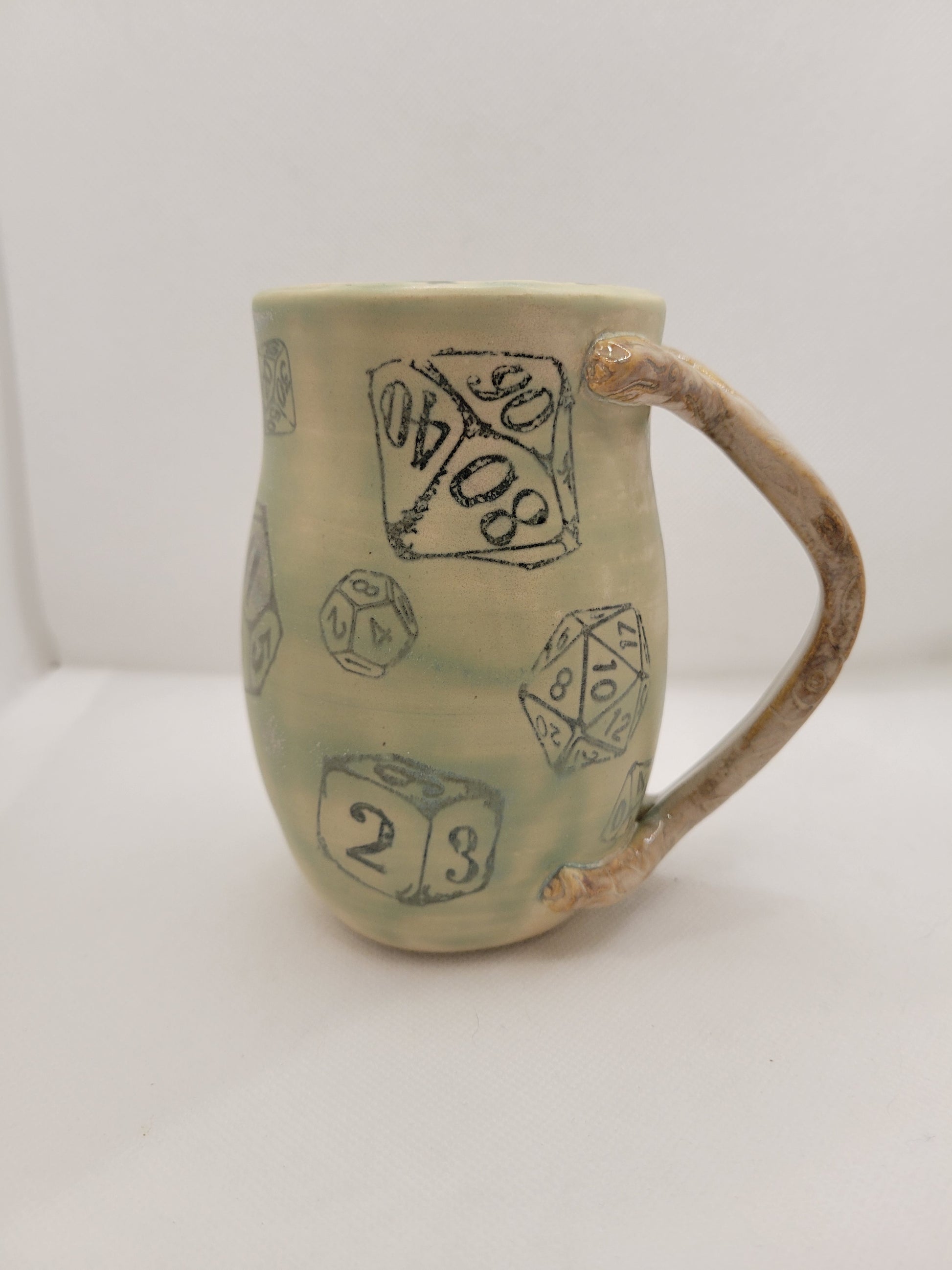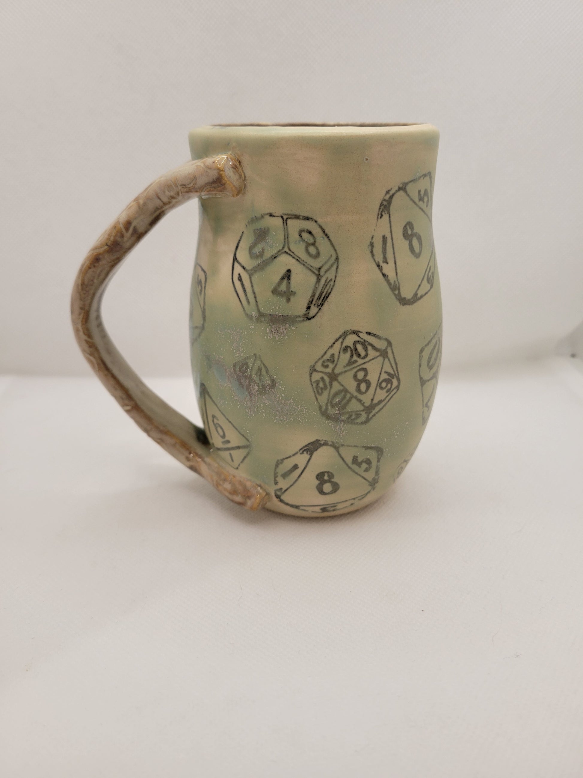 Step into the enchanting world of a Druid player in DnD. This mug was crafted to combined the nature DnD masters create for their players all while adding the dice which are the final decisions for any encounter. The handle is crafted to look like wood and feel the intricate grooves of the wood carved into it. The semi matte green flows over the dice and drips into a awe inspiring swirl of color into the mug. Holding 13 onces of your potion, this mug is also dishwasher and microwave safe.