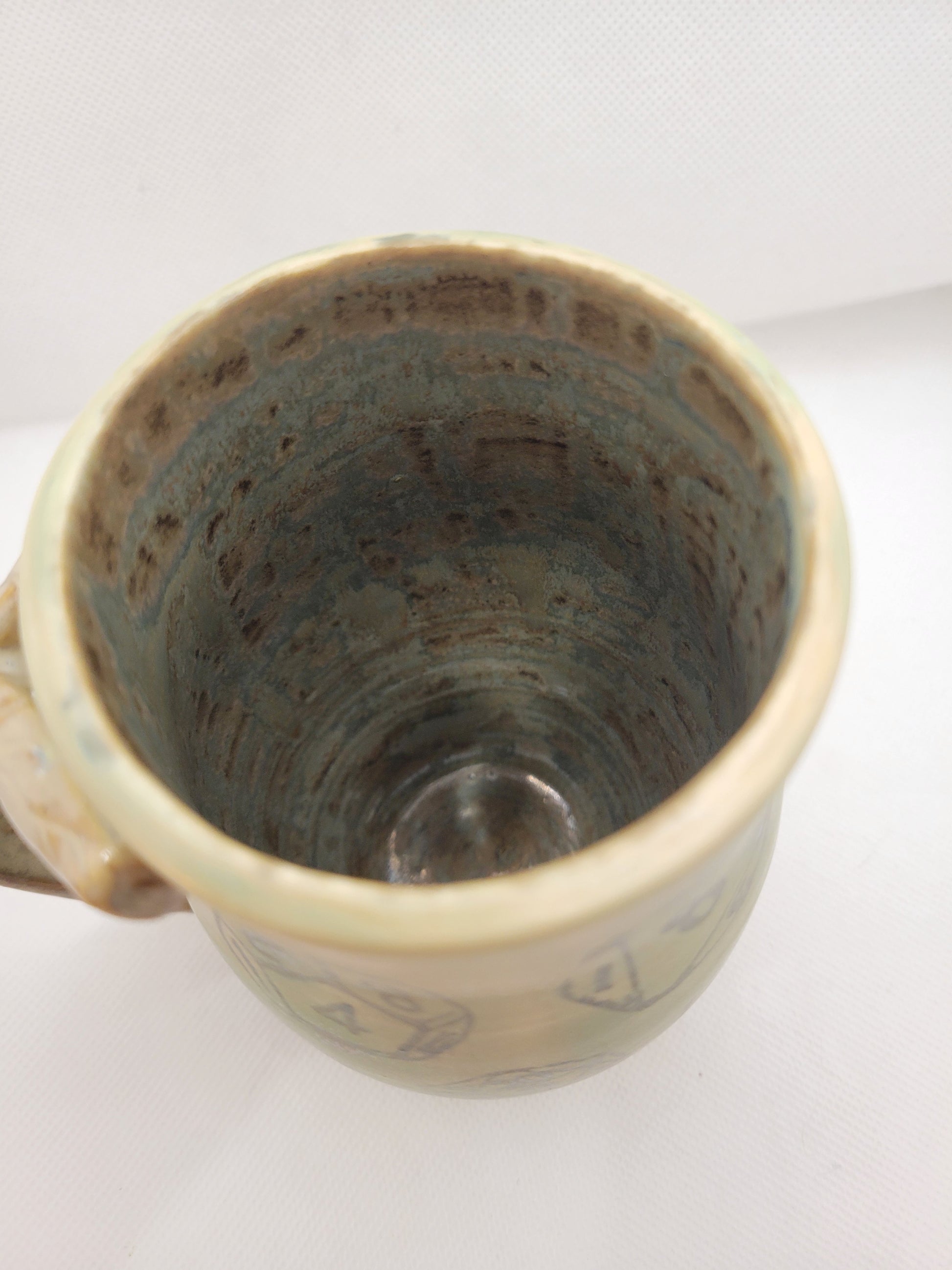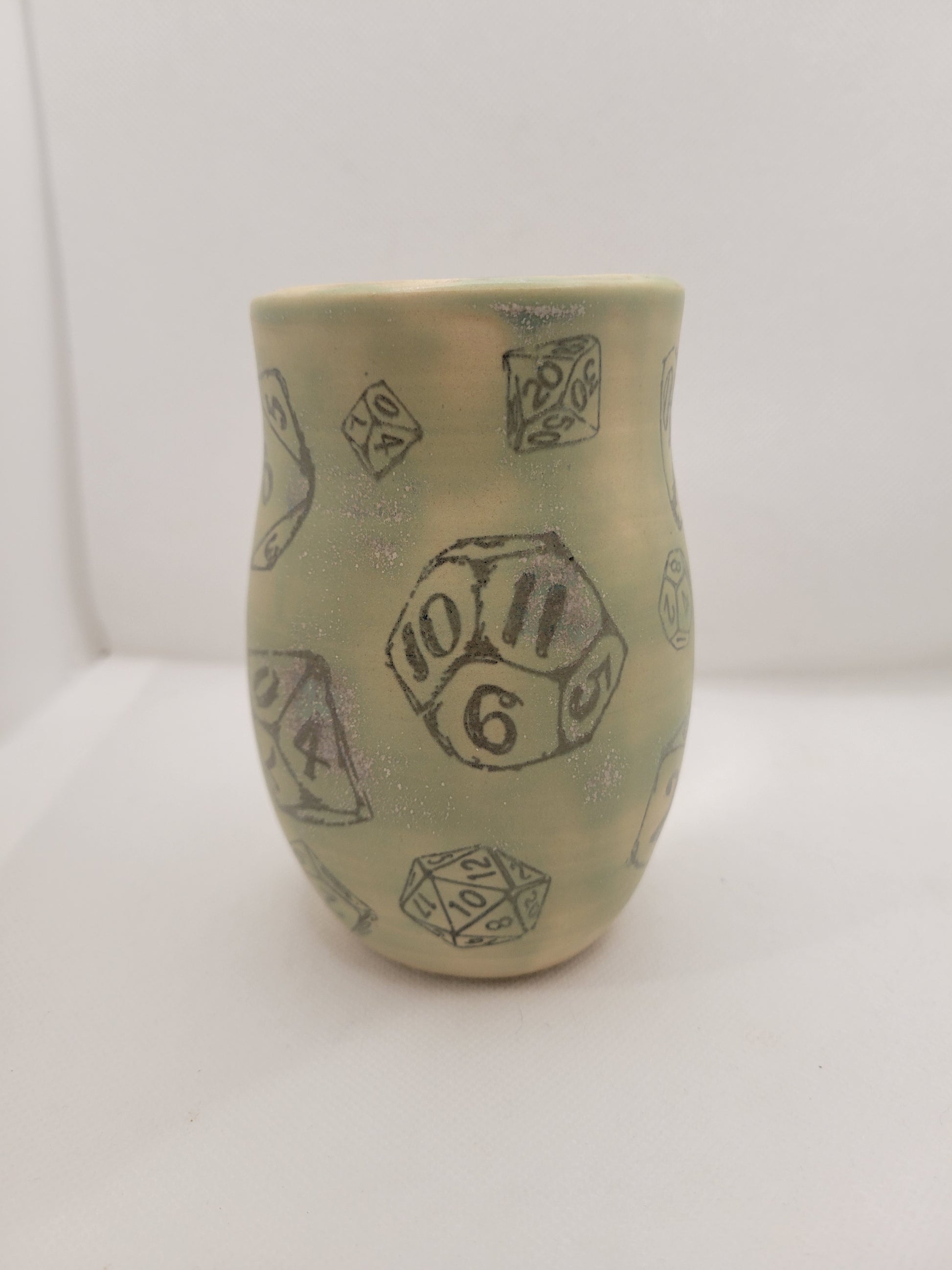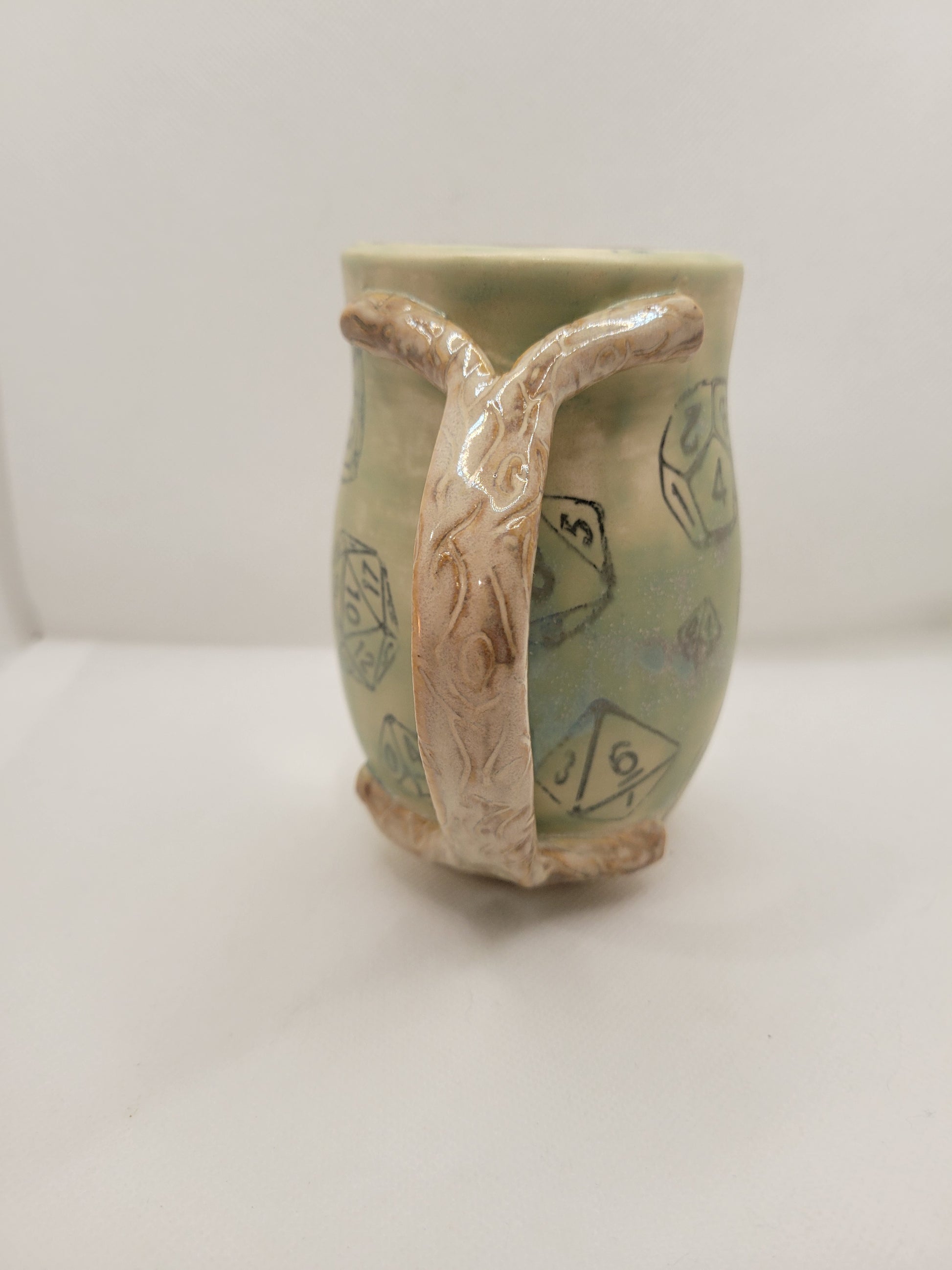 Step into the enchanting world of a Druid player in DnD. This mug was crafted to combined the nature DnD masters create for their players all while adding the dice which are the final decisions for any encounter. The handle is crafted to look like wood and feel the intricate grooves of the wood carved into it. The semi matte green flows over the dice and drips into a awe inspiring swirl of color into the mug. Holding 13 onces of your potion, this mug is also dishwasher and microwave safe.
