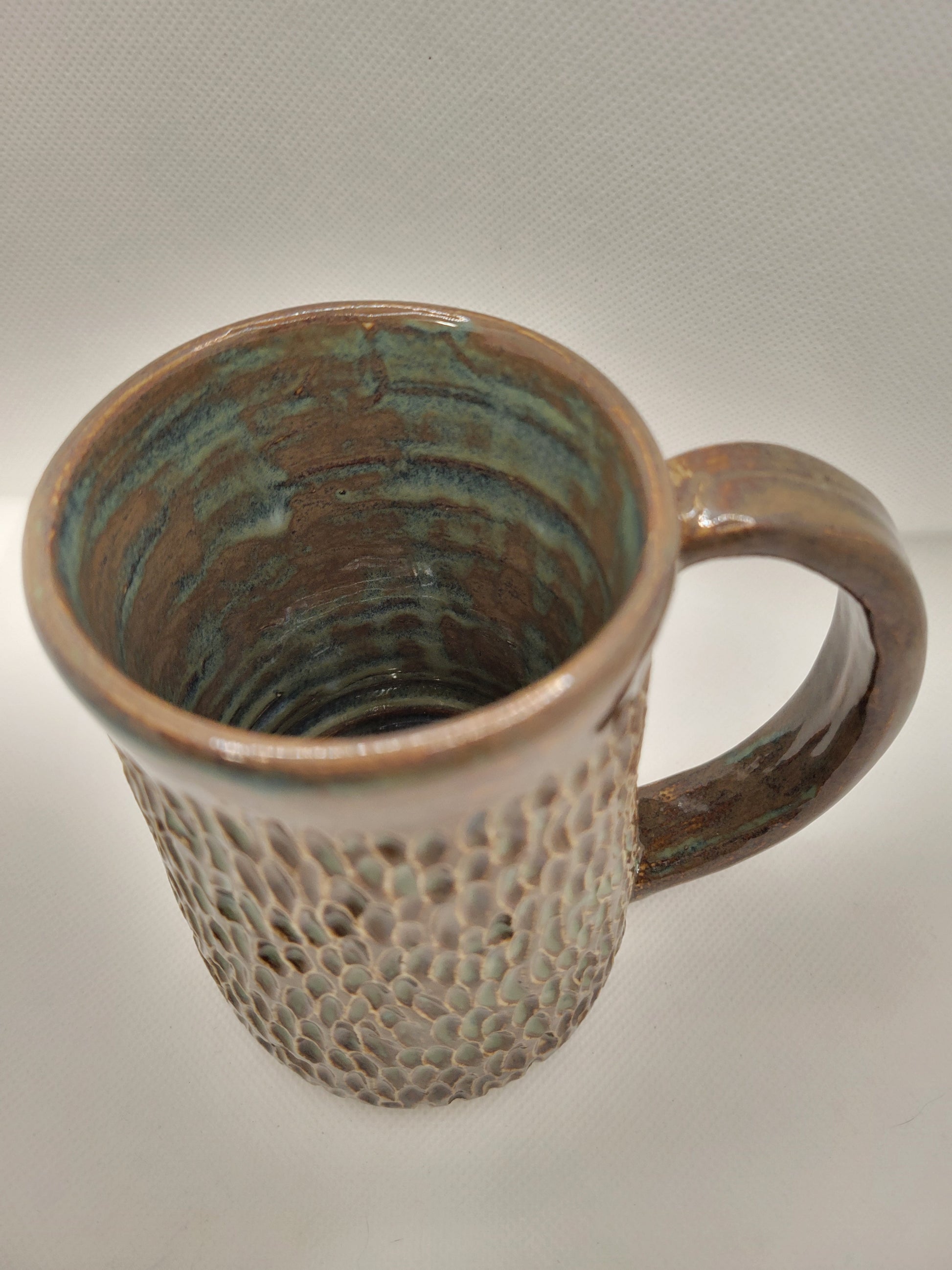 Kino blue is a stunning rock in America. With all the wonderful texture on this mug, it feels as though a rock left in a river to smooth over through the ages. This cup is such a pleasure to hold and to look at all the pooling blues in the hand carved sections. Holding 9 onces of your beverage, this mug will be an added delight to your evening routine to relaxe and remember the simple joys of life. Made of stoneware, allows this mug to be dishwasher and microwave safe.